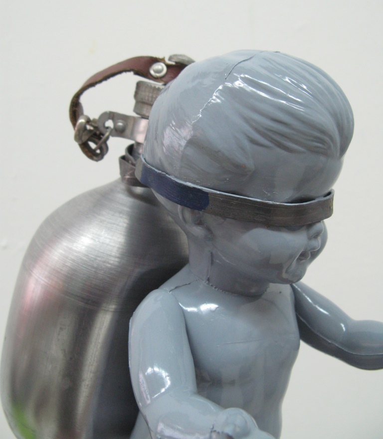 Is er een voorkeur voor het een of andere werk ? In de galerieruimte staat tamelijk pontificaal een grote grijze kast. Daarin bevinden zich 27 afzonderlijke objecten. De kast op zich is wel één geheel. Toch springen er bepaalde werken uit. De eerste aanblik van bijvoorbeeld het groothoofdig object typeert het fijngevoelige. De eraan verbonden samengevouwen handen onderstrepen een enigszins religieuze houding. Dit werk is ontstaan door samenstelling van verschillende oude en afgedankte materialen. De oorspronkelijke kleuren van die materialen zouden een andere beleving hebben gegeven in dit werk. Het grijs heeft in dit geval een uitwerking die je doet fluisteren. En dan wat onder die handen is betreft het ‘ kleinood kind ‘ dat gezegend en beschermd moet worden ! Een zo’n groot denkend hoofd met androgyne uitstraling kan dat het onschuldige behoeden ?